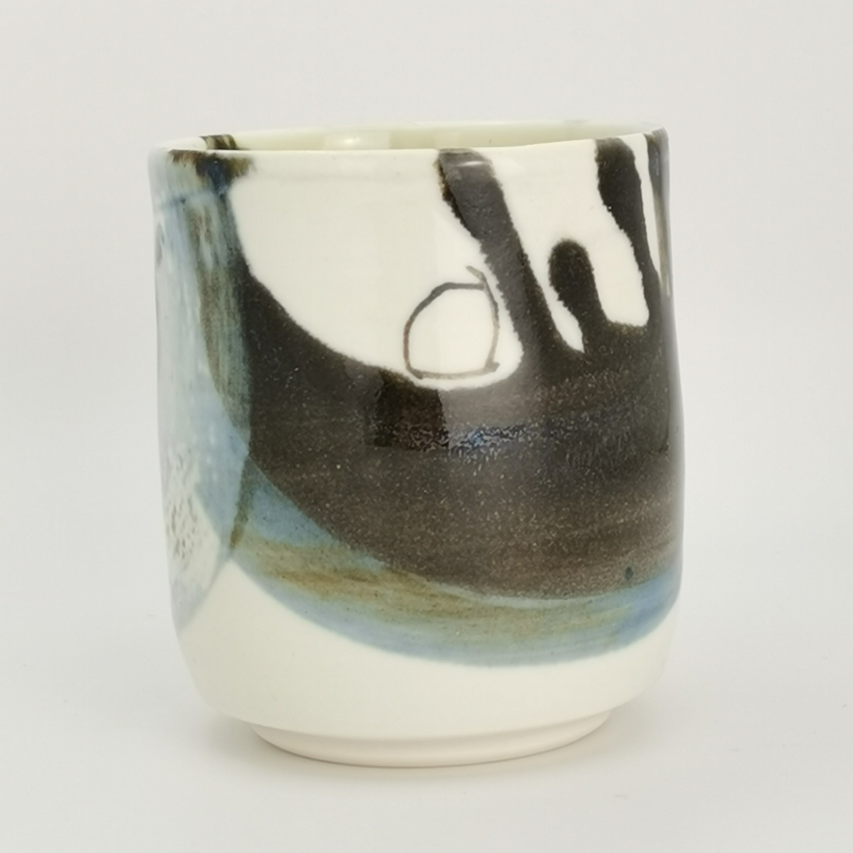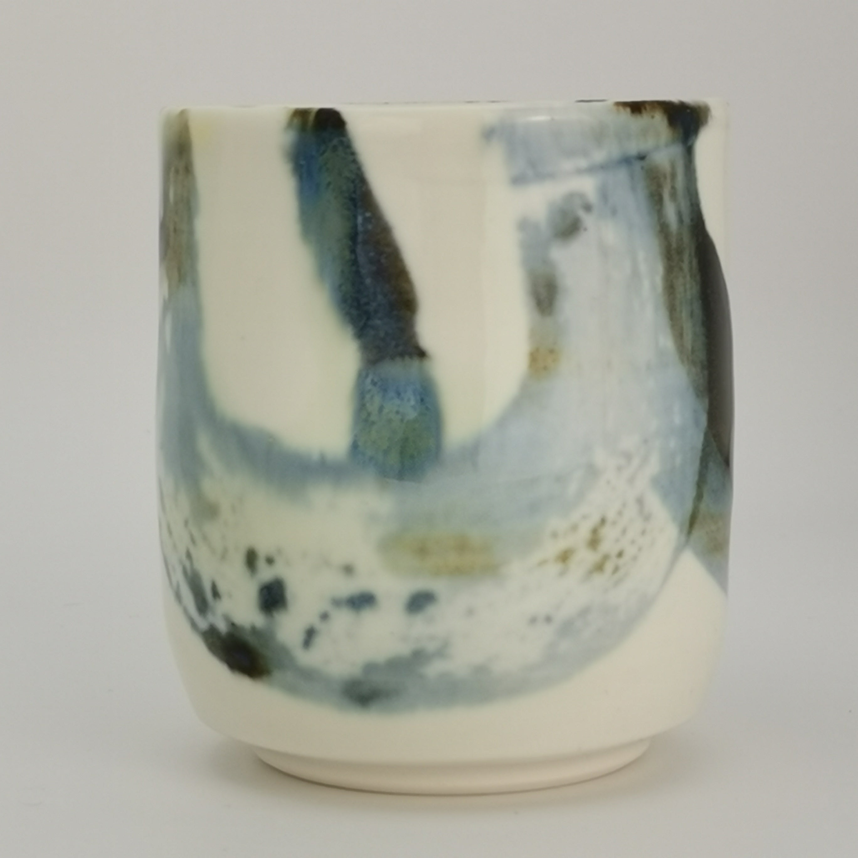 A medium sized cup, wheel thrown in porcelain and individually glazed in multiple gestural brush strokes.