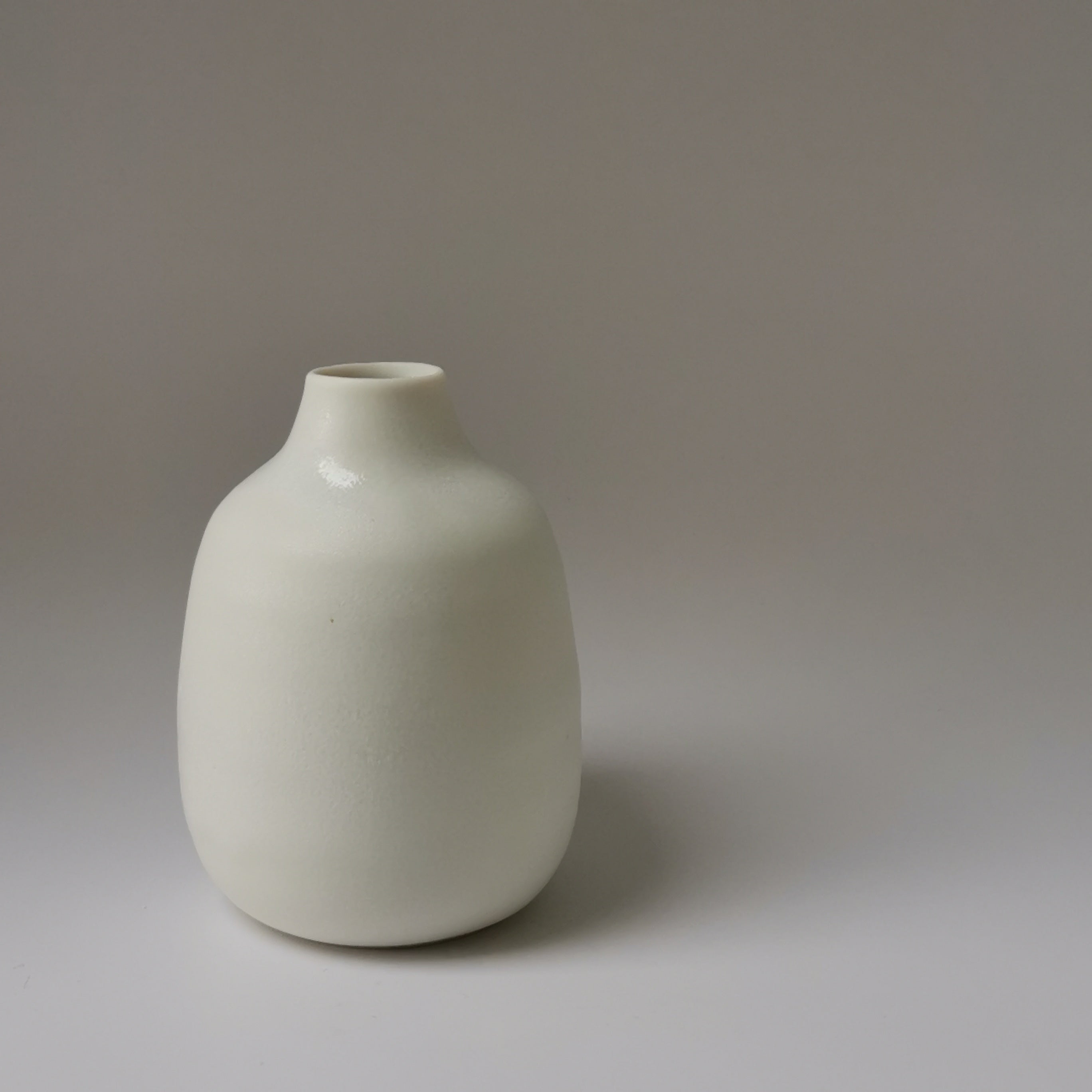 Wheel thrown porcelain bottle vase in satin white glaze. H 80mm x W 55mm